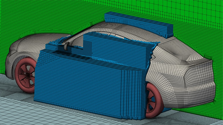 灵活拆分复杂几何(如车身、后视镜、轮胎),近壁面非结构六面体网格与笛卡尔背景网格重叠,解决近壁面网格质量降低问题,提升仿真可靠性。