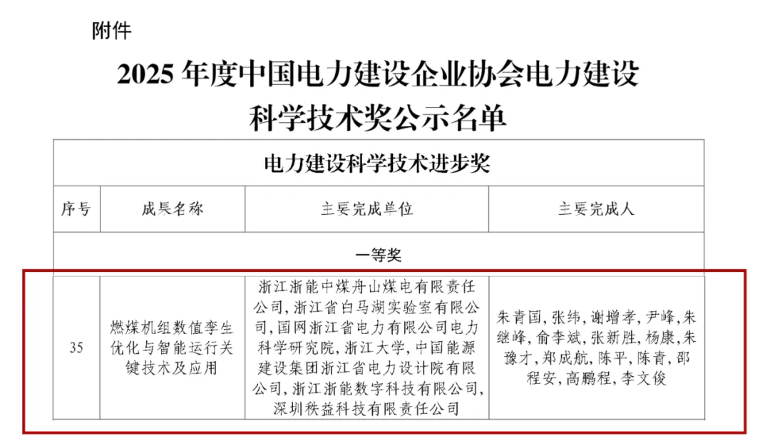 近日,中国电力建设企业协会公布了2025年度电力建设科学技术进步奖评选结果。秩益科技参与的《燃煤机组数值孪生优化与智能运行关键技术及应用》项目荣获电力建设科学技术进步一等奖。
